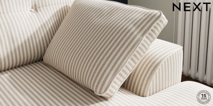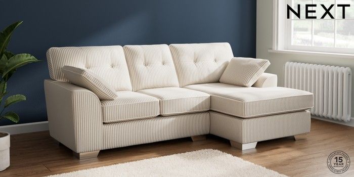 7.3.1 Buy Stamford Buttoned Back Small Sofa Chaise - Right Hand Chenille Stripe Natural Large Square Angle - Chrome Metal from the Next UK online shop Click here to use our accessible website
