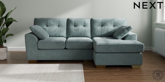 7.2.10 Buy Stamford Buttoned Back Small Sofa Chaise - Right Hand Chunky Chenille Light Teal Green Large Square Angle - Brushed Brass from the Next UK online shop Click here to use our accessible website
