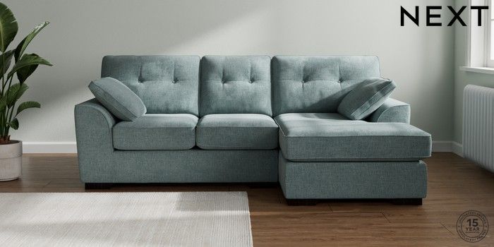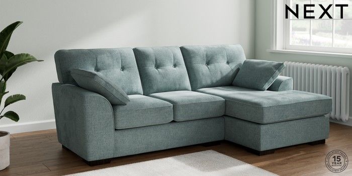 7.2.10 Buy Stamford Buttoned Back Small Sofa Chaise - Right Hand Chunky Chenille Light Teal Green Large Square Angle - Dark from the Next UK online shop Click here to use our accessible website