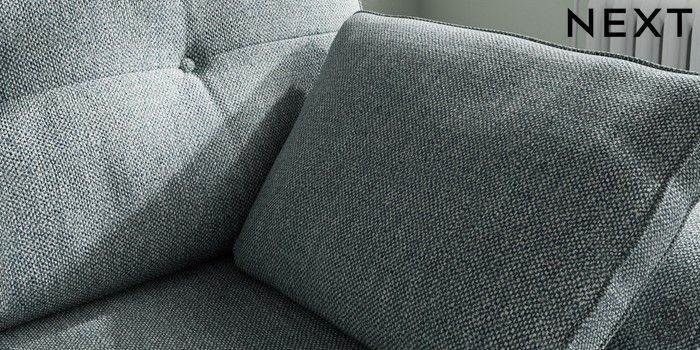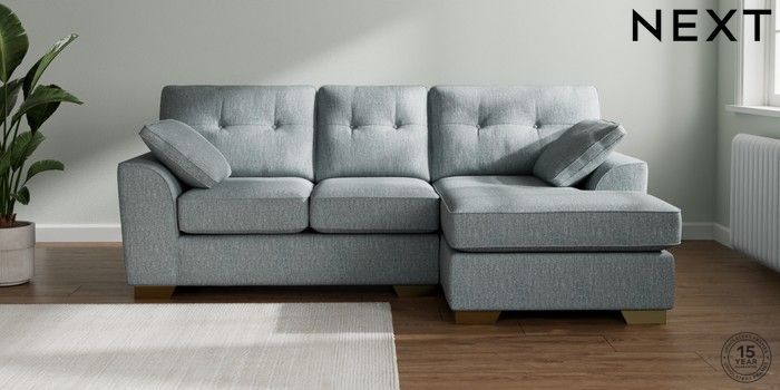 7.2.10 Buy Stamford Buttoned Back Small Sofa Chaise - Right Hand Chunky Weave Mid Blue Large Square Angle - Brushed Brass from the Next UK online shop Click here to use our accessible website