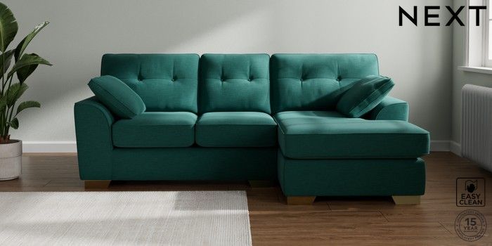 7.2.10 Buy Stamford Buttoned Back Small Sofa Chaise - Right Hand Fine Chenille Easy Clean Dark Juniper Green Large Square Angle - Brushed Brass from the Next UK online shop Click here to use our accessible website