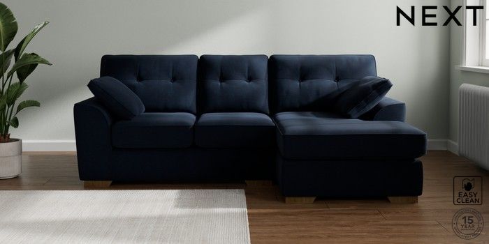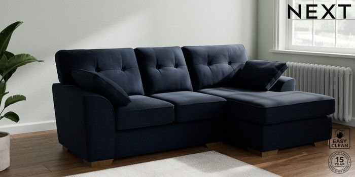 7.2.10 Buy Stamford Buttoned Back Small Sofa Chaise - Right Hand Fine Chenille Easy Clean Dark Navy Blue Large Square Angle - Mid from the Next UK online shop Click here to use our accessible website