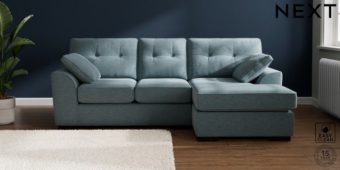 7.2.10 Buy Stamford Buttoned Back Small Sofa Chaise - Right Hand Fine Chenille Easy Clean Mid Blue Large Square Angle - Dark from the Next UK online shop Click here to use our accessible website