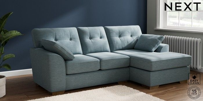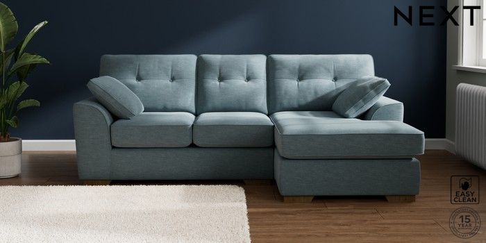 7.2.10 Buy Stamford Buttoned Back Small Sofa Chaise - Right Hand Fine Chenille Easy Clean Mid Blue Large Square Angle - Mid from the Next UK online shop Click here to use our accessible website