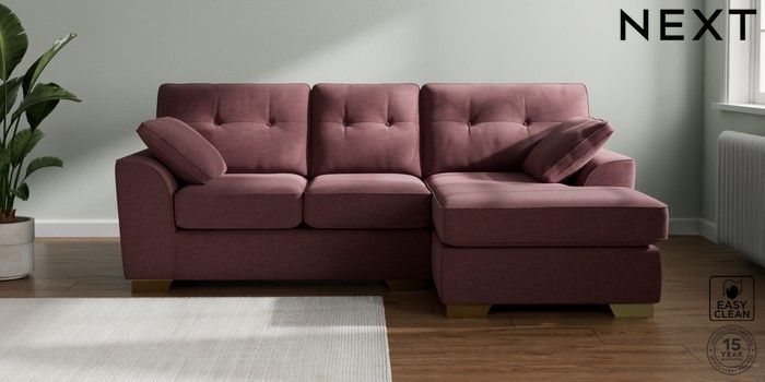 7.3.1 Buy Stamford Buttoned Back Small Sofa Chaise - Right Hand Fine Chenille Easy Clean Mid Mulberry Purple Large Square Angle - Brushed Brass from the Next UK online shop Click here to use our accessible website