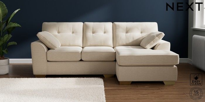 7.2.10 Buy Stamford Buttoned Back Small Sofa Chaise - Right Hand Fine Chenille Easy Clean Oyster Large Square Angle - Brushed Brass from the Next UK online shop Click here to use our accessible website