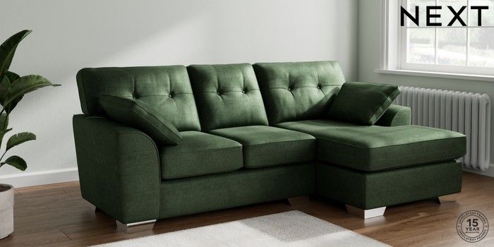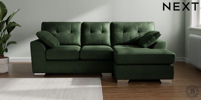 7.2.10 Buy Stamford Buttoned Back Small Sofa Chaise - Right Hand Luxe Chenille Dark Green Large Square Angle - Chrome Metal from the Next UK online shop Click here to use our accessible website