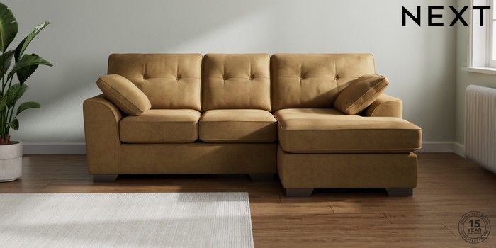 7.2.6 Buy Stamford Buttoned Back Small Sofa Chaise - Right Hand Luxe Chenille Honey Yellow Large Square Angle - Gunmetal from the Next UK online shop Click here to use our accessible website