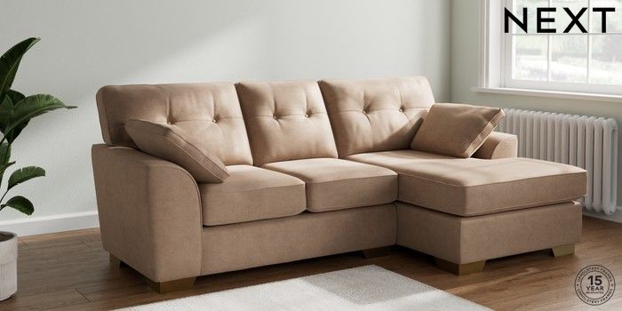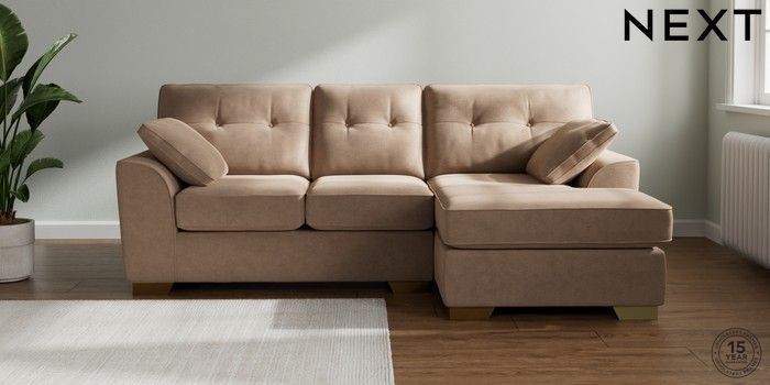 7.2.10 Buy Stamford Buttoned Back Small Sofa Chaise - Right Hand Luxe Chenille Mid Natural Large Square Angle - Brushed Brass from the Next UK online shop Click here to use our accessible website