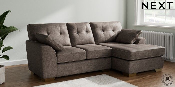 7.2.10 Buy Stamford Buttoned Back Small Sofa Chaise - Right Hand Plush Chenille Mink Brown Large Square Angle - Brushed Brass from the Next UK online shop Click here to use our accessible website