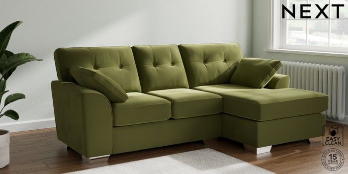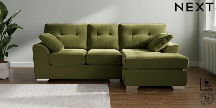 7.3.1 Buy Stamford Buttoned Back Small Sofa Chaise - Right Hand Plush Velvet Easy Clean Mid Olive Green Large Square Angle - Chrome Metal from the Next UK online shop Click here to use our accessible website