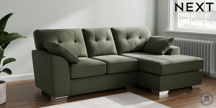 7.3.1 Buy Stamford Buttoned Back Small Sofa Chaise - Right Hand Relaxed Linen Look Dark Green Large Square Angle - Chrome Metal from the Next UK online shop Click here to use our accessible website