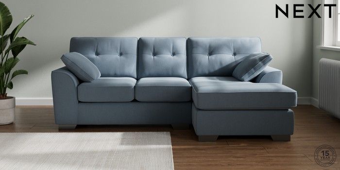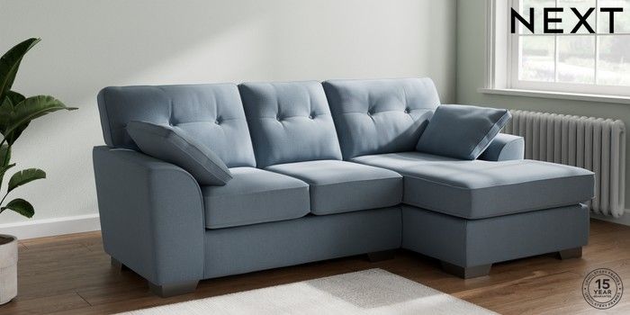 7.3.1 Buy Stamford Buttoned Back Small Sofa Chaise - Right Hand Relaxed Linen Look Mid Blue Large Square Angle - Gunmetal from the Next UK online shop Click here to use our accessible website