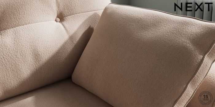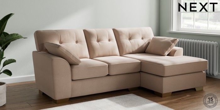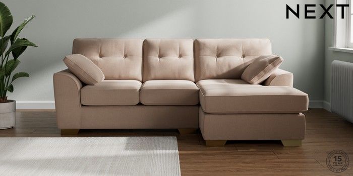 7.3.1 Buy Stamford Buttoned Back Small Sofa Chaise - Right Hand Relaxed Linen Look Mid Natural Large Square Angle - Brushed Brass from the Next UK online shop Click here to use our accessible website