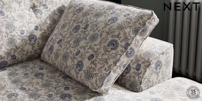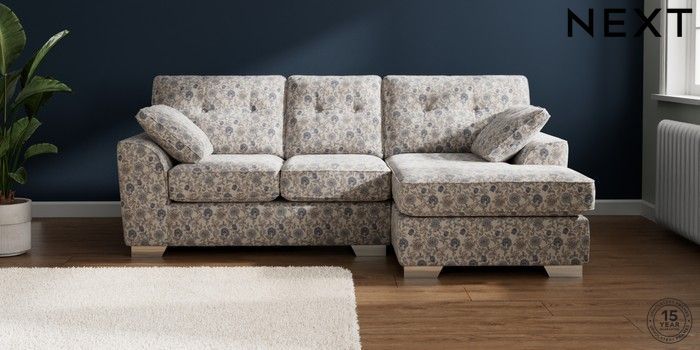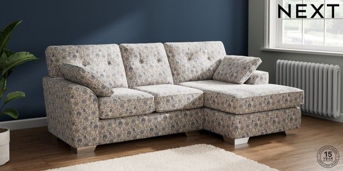 7.3.1 Buy Stamford Buttoned Back Small Sofa Chaise - Right Hand Relaxed Linen Look Print Woodblock Floral Blue Large Square Angle - Chrome Metal from the Next UK online shop Click here to use our accessible website