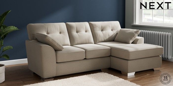 7.2.10 Buy Stamford Buttoned Back Small Sofa Chaise - Right Hand Ripple Chenille Light Natural Large Square Angle - Chrome Metal from the Next UK online shop Click here to use our accessible website