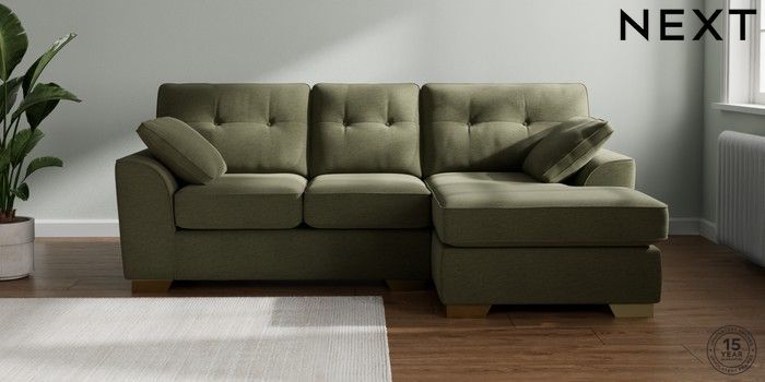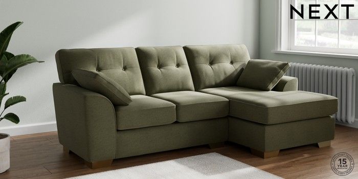 7.2.10 Buy Stamford Buttoned Back Small Sofa Chaise - Right Hand Ripple Chenille Mid Moss Green Large Square Angle - Brushed Brass from the Next UK online shop Click here to use our accessible website