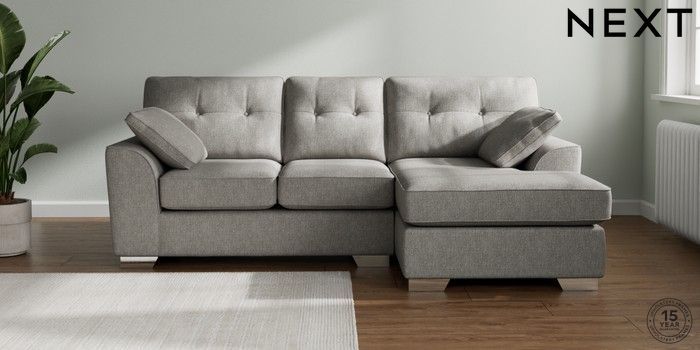 7.2.10 Buy Stamford Buttoned Back Small Sofa Chaise - Right Hand Tweedy Chenille Mid Grey Large Square Angle - Chrome Metal from the Next UK online shop Click here to use our accessible website