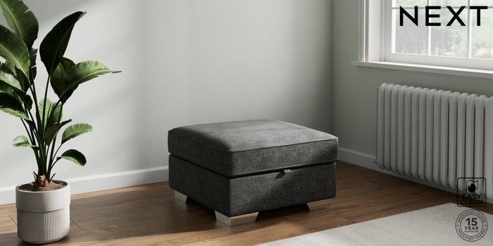 7.2.10 Buy Stamford Buttoned Back Storage Footstool Boucle Weave Easy Clean Charcoal Grey Square Angle - Chrome Metal from the Next UK online shop Click here to use our accessible website