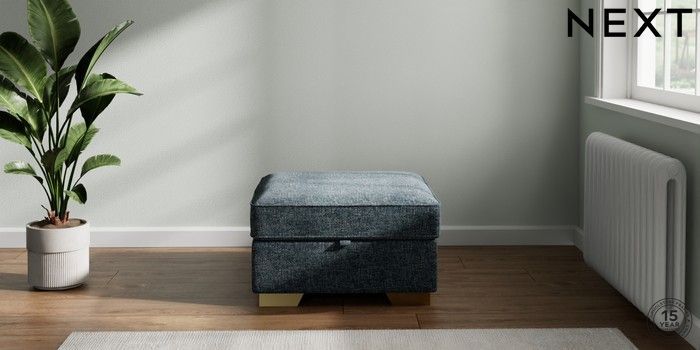 7.2.10 Buy Stamford Buttoned Back Storage Footstool Chunky Chenille Dark Navy Blue Square Angle - Brushed Brass from the Next UK online shop Click here to use our accessible website