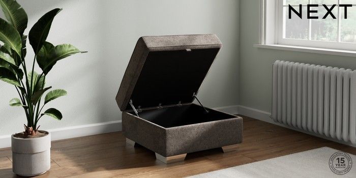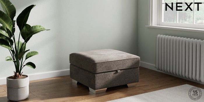 7.2.10 Buy Stamford Buttoned Back Storage Footstool Chunky Chenille Mink Brown Square Angle - Chrome Metal from the Next UK online shop Click here to use our accessible website