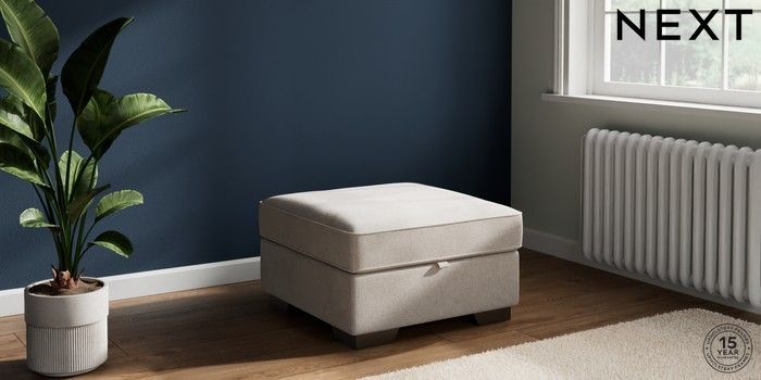 7.2.10 Buy Stamford Buttoned Back Storage Footstool Chunky Chenille Oyster Square Angle - Gunmetal from the Next UK online shop Click here to use our accessible website