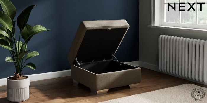 7.2.10 Buy Stamford Buttoned Back Storage Footstool Chunky Marl Light Olive Green Square Angle - Chrome Metal from the Next UK online shop Click here to use our accessible website