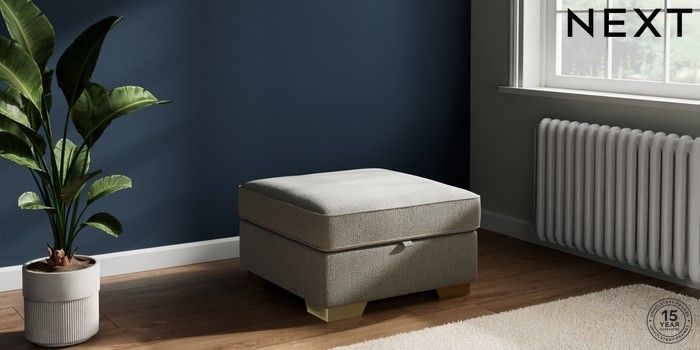 7.2.10 Buy Stamford Buttoned Back Storage Footstool Chunky Texture Dove Square Angle - Brushed Brass from the Next UK online shop Click here to use our accessible website