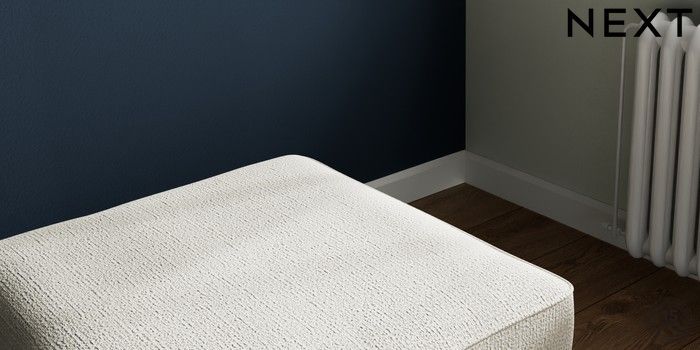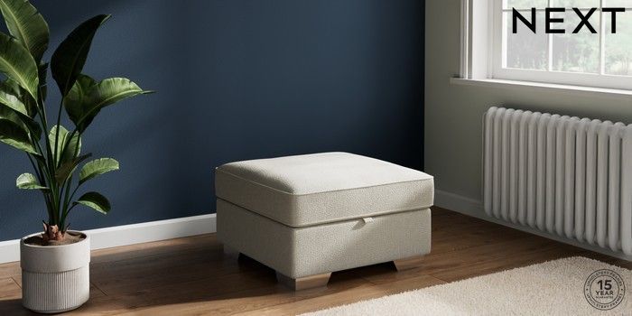 7.2.10 Buy Stamford Buttoned Back Storage Footstool Chunky Texture Oyster Square Angle - Chrome Metal from the Next UK online shop Click here to use our accessible website
