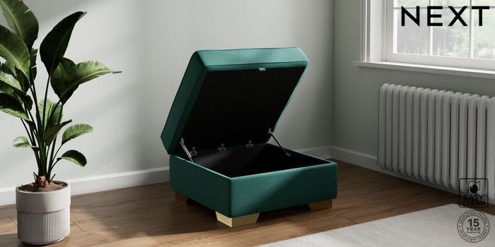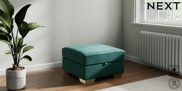 7.2.10 Buy Stamford Buttoned Back Storage Footstool Fine Chenille Easy Clean Dark Juniper Green Square Angle - Brushed Brass from the Next UK online shop Click here to use our accessible website