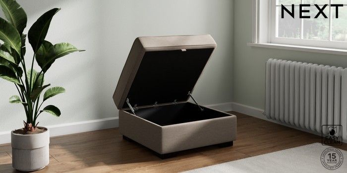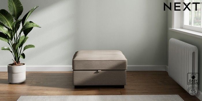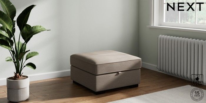 7.2.6 Buy Stamford Buttoned Back Storage Footstool Fine Chenille Easy Clean Mid Taupe Brown Square Angle - Dark from the Next UK online shop Click here to use our accessible website