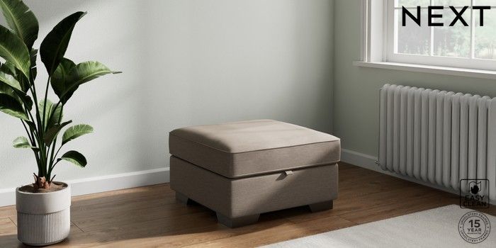 7.2.10 Buy Stamford Buttoned Back Storage Footstool Fine Chenille Easy Clean Mid Taupe Brown Square Angle - Gunmetal from the Next UK online shop Click here to use our accessible website
