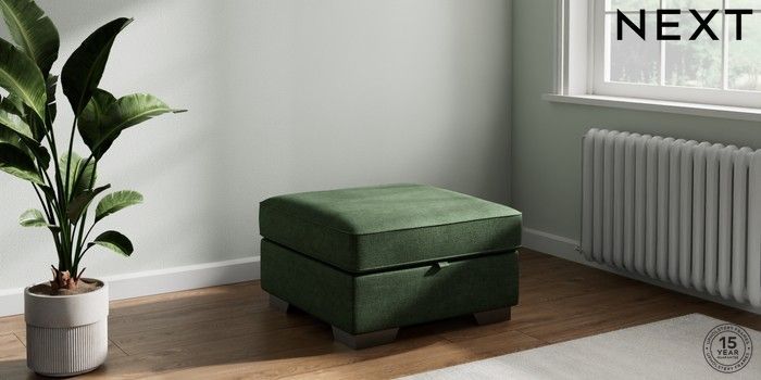 7.2.10 Buy Stamford Buttoned Back Storage Footstool Luxe Chenille Dark Green Square Angle - Gunmetal from the Next UK online shop Click here to use our accessible website