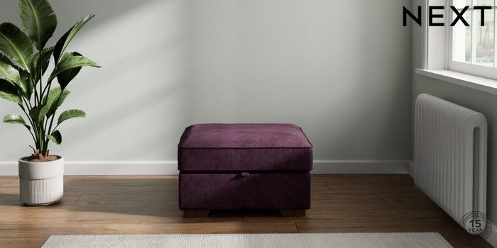7.2.10 Buy Stamford Buttoned Back Storage Footstool Plush Chenille Dark Plum Purple Square Angle - Mid from the Next UK online shop Click here to use our accessible website