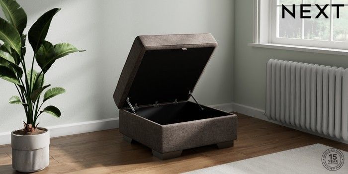 7.2.10 Buy Stamford Buttoned Back Storage Footstool Plush Chenille Mink Brown Square Angle - Gunmetal from the Next UK online shop Click here to use our accessible website