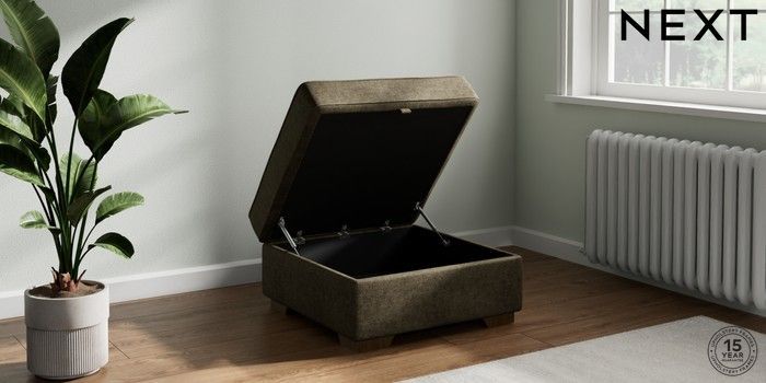 7.2.10 Buy Stamford Buttoned Back Storage Footstool Plush Chenille Moss Green Square Angle - Mid from the Next UK online shop Click here to use our accessible website