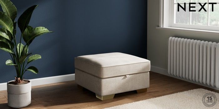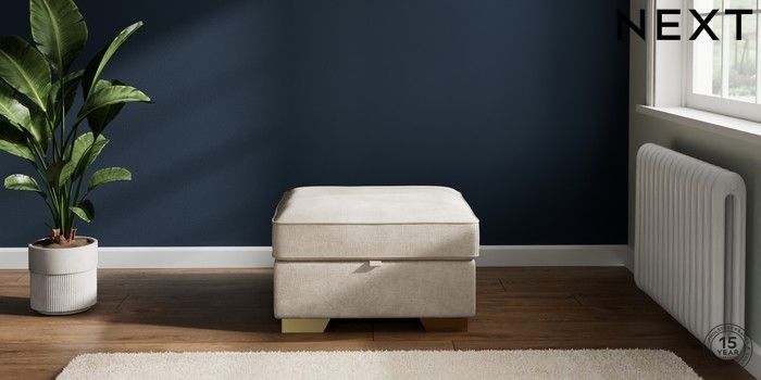 7.2.10 Buy Stamford Buttoned Back Storage Footstool Plush Chenille Oyster Square Angle - Brushed Brass from the Next UK online shop Click here to use our accessible website