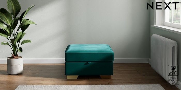 7.2.10 Buy Stamford Buttoned Back Storage Footstool Plush Velvet Easy Clean Juniper Green Square Angle - Brushed Brass from the Next UK online shop Click here to use our accessible website
