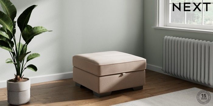 7.2.10 Buy Stamford Buttoned Back Storage Footstool Relaxed Linen Look Mid Natural Square Angle - Gunmetal from the Next UK online shop Click here to use our accessible website