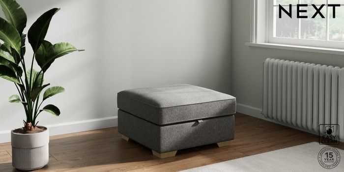 7.2.6 Buy Stamford Buttoned Back Storage Footstool Tweedy Blend Easy Clean Dark Grey Square Angle - Light from the Next UK online shop Click here to use our accessible website