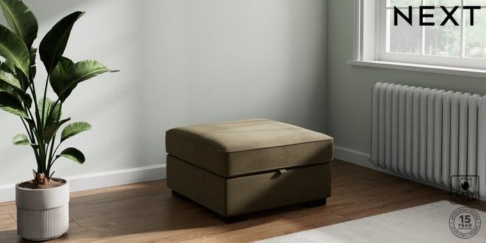 7.2.6 Buy Stamford Buttoned Back Storage Footstool Fine Chenille Easy Clean Dark Moss Green Square Angle - Dark from the Next UK online shop Click here to use our accessible website