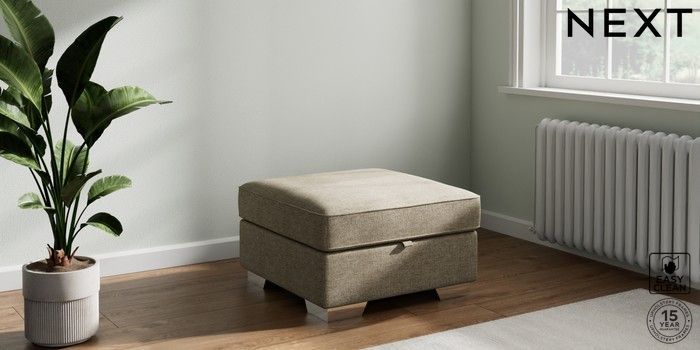 7.2.10 Buy Stamford Buttoned Back Storage Footstool Woven Chenille Easy Clean Mid Natural Square Angle - Chrome Metal from the Next UK online shop Click here to use our accessible website