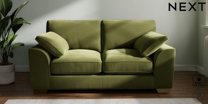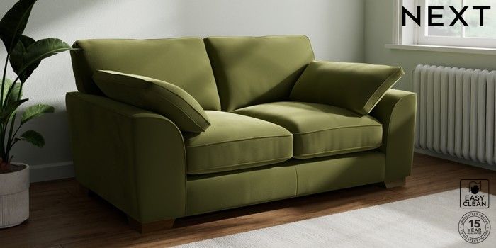 7.3.1 Buy Stamford Grand Relaxed Sit 2 Seater Sofa Plush Velvet Easy Clean Mid Olive Green Large Square Angle - Brushed Brass from the Next UK online shop Click here to use our accessible website