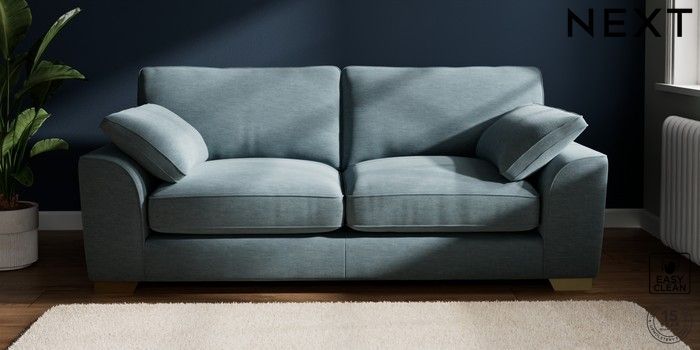 7.3.1 Buy Stamford Grand Relaxed Sit 3 Seater Sofa Fine Chenille Easy Clean Mid Blue Large Square Angle - Brushed Brass from the Next UK online shop Click here to use our accessible website