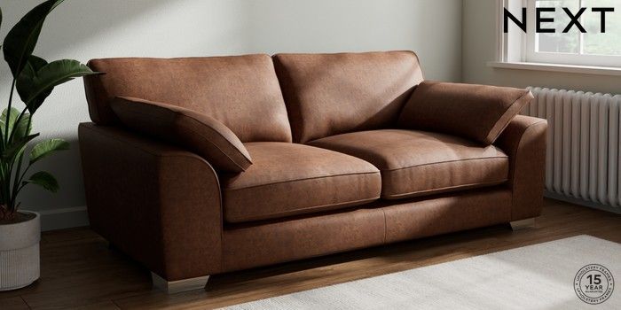 7.3.1 Buy Stamford Grand Relaxed Sit 3 Seater Sofa Monza Faux Leather Easy Clean Chestnut Brown Large Square Angle - Chrome Metal from the Next UK online shop