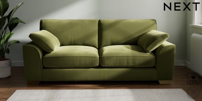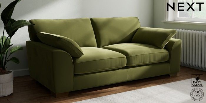 7.3.1 Buy Stamford Grand Relaxed Sit 3 Seater Sofa Plush Velvet Easy Clean Mid Olive Green Large Square Angle - Brushed Brass from the Next UK online shop Click here to use our accessible website