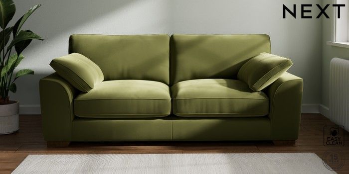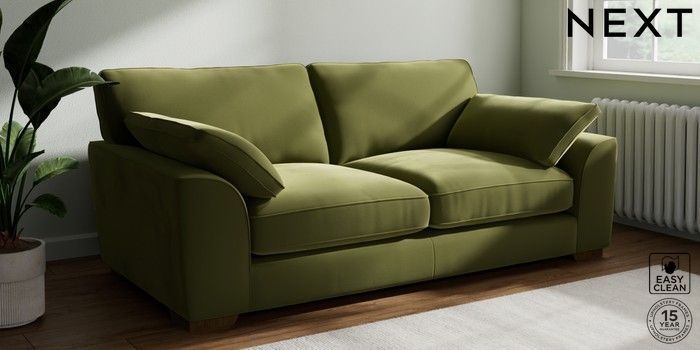 7.3.1 Buy Stamford Grand Relaxed Sit 3 Seater Sofa Plush Velvet Easy Clean Mid Olive Green Large Square Angle - Mid from the Next UK online shop Click here to use our accessible website