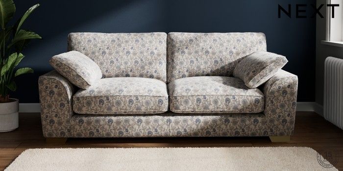 7.2.10 Buy Stamford Grand Relaxed Sit 3 Seater Sofa Relaxed Linen Look Print Woodblock Floral Blue Large Square Angle - Brushed Brass from the Next UK online shop Click here to use our accessible website
