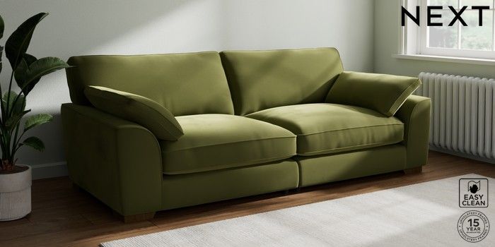 7.3.1 Buy Stamford Grand Relaxed Sit 4 Seater Sofa Plush Velvet Easy Clean Mid Olive Green Large Square Angle - Mid from the Next UK online shop Click here to use our accessible website