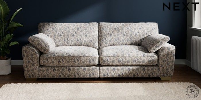 7.2.10 Buy Stamford Grand Relaxed Sit 4 Seater Sofa Relaxed Linen Look Print Woodblock Floral Blue Large Square Angle - Brushed Brass from the Next UK online shop Click here to use our accessible website